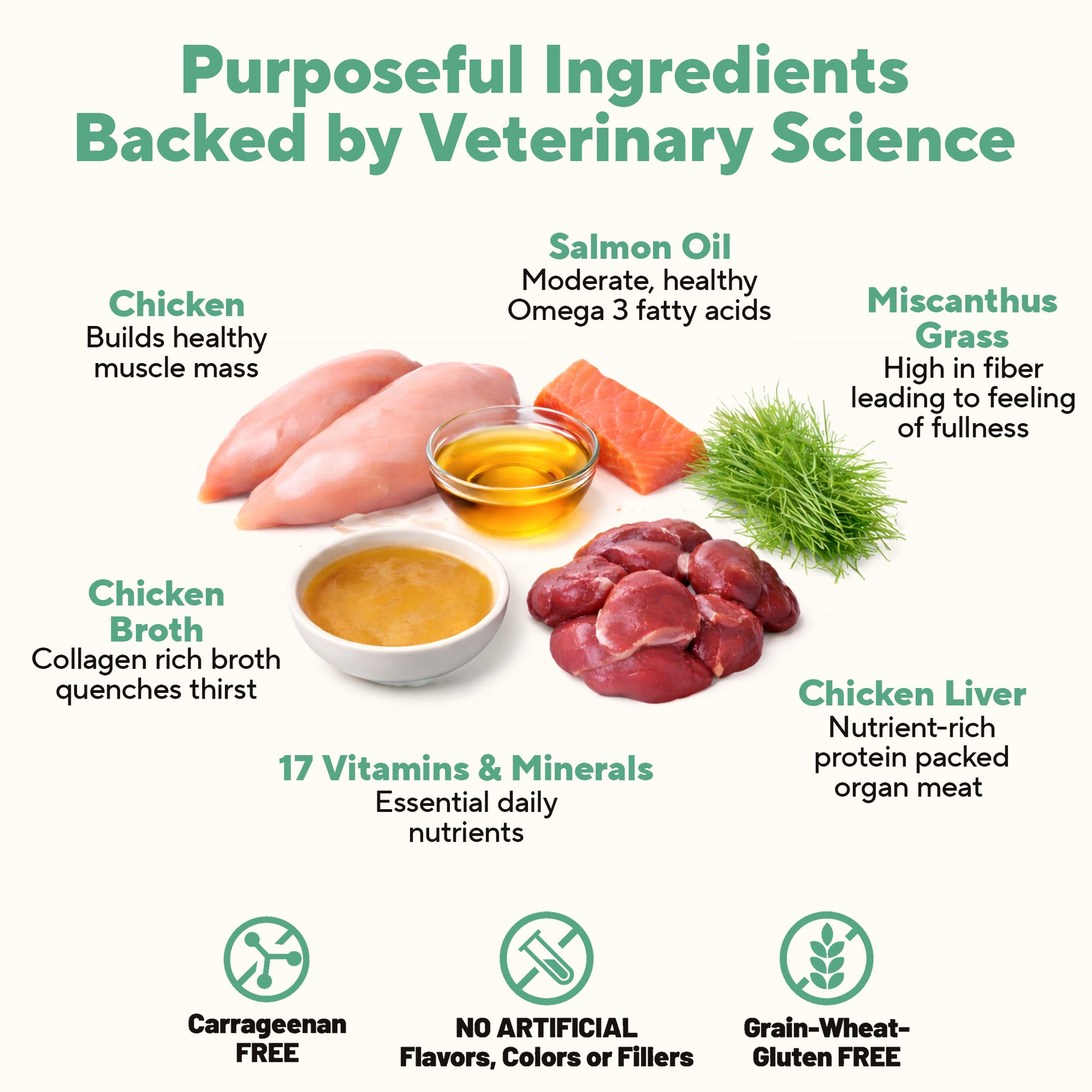 Ingredients: MADE IN MINNESOTA / Chicken Broth, Chicken, Chicken Liver, Dried Yeast, Miscanthus Grass, Egg, Natural Flavor, Tricalcium Phosphate, Salmon Oil (Preserved With Mixed Tocopherols), Carrots, Agar Agar, Minerals (Zinc Proteinate, Iron Proteinate, Copper Proteinate, Manganese Proteinate, Sodium Selenite, Ethylenediamine Dihydroiodide), Salt, Vitamins (Vitamin E Supplement, Niacin Supplement, Thiamine Mononitrate, D-Calcium Pantothenate, Vitamin A Supplement, Riboflavin Supplement, Vitamin B12 Supplement, Pyridoxine Hydrochloride, Biotin, Folic Acid, Vitamin D3 Supplement), Dried Chicory Root (Source of Inulin), Marine Microalgae Oil, Choline Chloride, L-Carnitine.