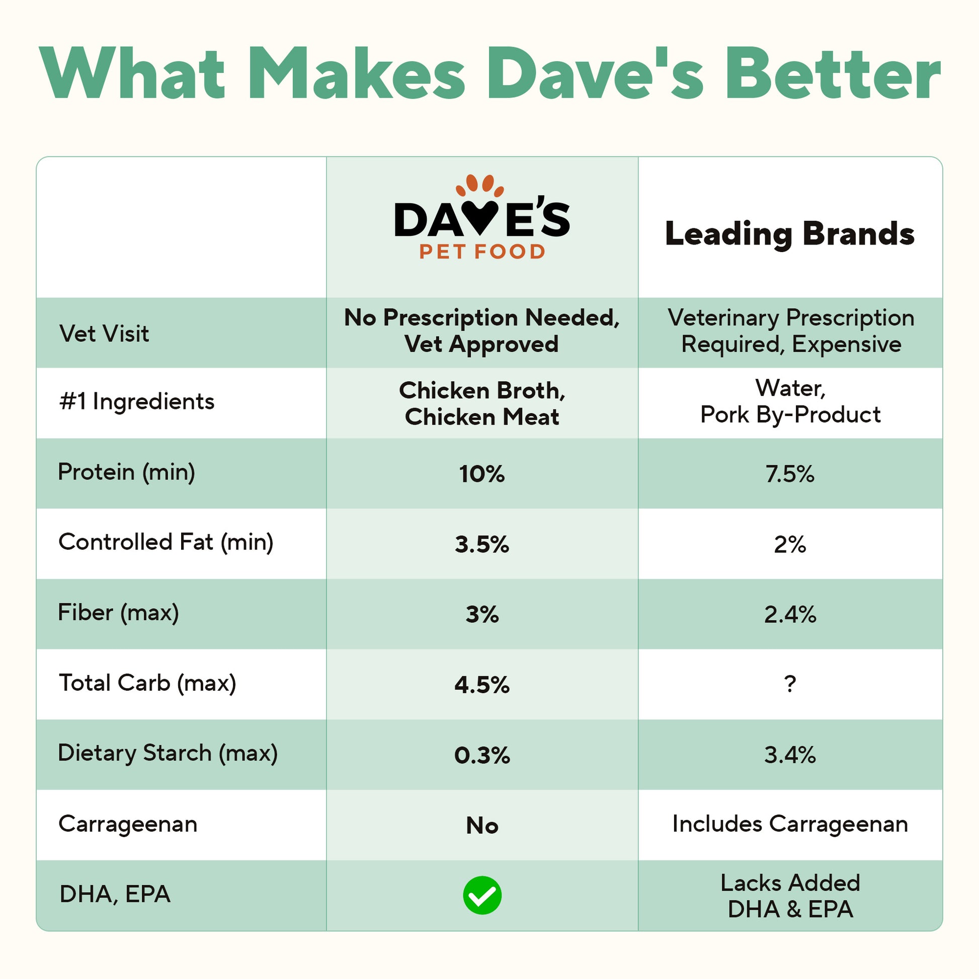 Dave’s Pet Food Carbolight Chicken Dinner is designed for diabetic dogs who need balanced nutrition with controlled starch, fat and protein levels. Made with real chicken and chicken liver in a delicious loaf texture, this veterinarian-reviewed formula provides complete and balanced nutrition for adult dogs. L-Carnitine supports fat metabolism and lean muscle maintenance, while essential vitamins and minerals promote overall health. With no artificial colors or flavors, Carbolight delivers wholesome, great-tasting nutrition for dogs managing weight or glucose levels. Proudly made in the USA with globally sourced ingredients.