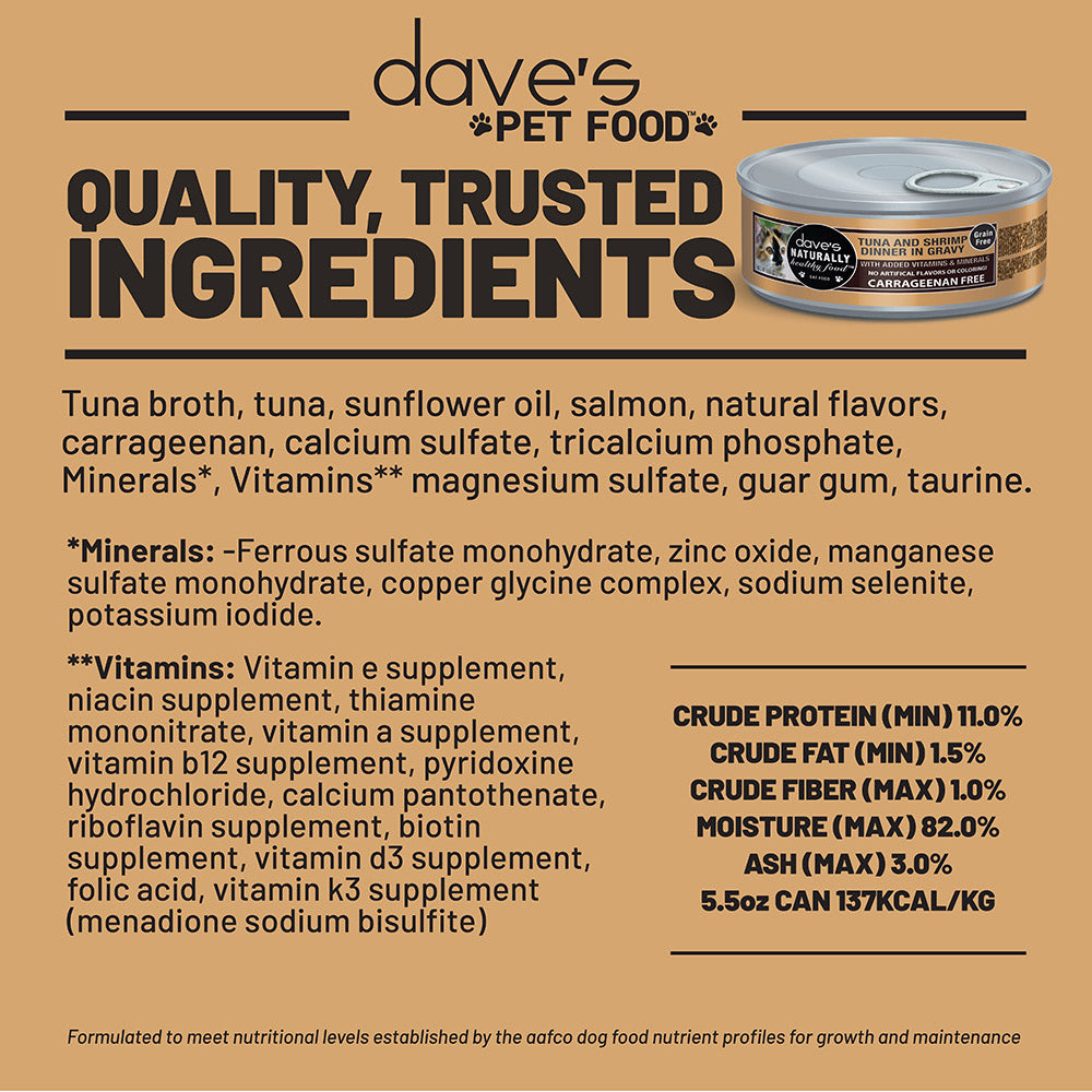 Dave made it his mission to bring you the best, balanced meals at the best value. And his Naturally Healthy, grain free recipes are no exception. Just take a look at the ingredients, including real tuna and shrimp as its main sources of protein, and added vitamins and minerals for a nutritional boost . What’s missing? Cereal fillers, wheat, soy, and gluten.